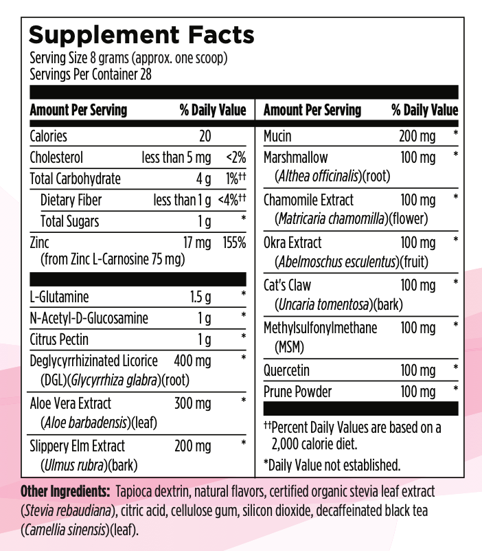 The ingredients in this drinkable powder work together to soothe, protect, and may help repair the GI lining, while also promoting regularity and a healthy inflammatory response.