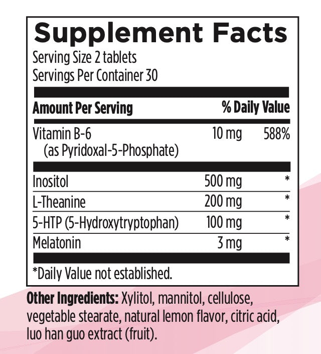 - Vitamin B6, inositol and L-theanine for additional help in supporting the body’s natural ability to fall asleep and stay asleep.